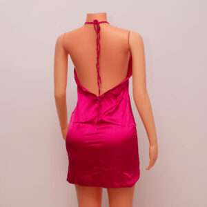 Turn heads in this Ruby Hot Pink Open-Back Ruched Mini Dress, a bold and vibrant piece that blends playful charm with sultry elegance. Designed with a high neckline and short sleeves for a sleek front look, the surprise comes with the daring open-back detail, finished with an adjustable tie for a secure and flattering fit.The mini-length hem features a subtle ruched accent at the front, adding a flirty edge to the streamlined silhouette. Crafted from a soft, stretchy fabric that hugs your curves, this dress is perfect for parties, date nights, or any moment that calls for confident, stand-out style.