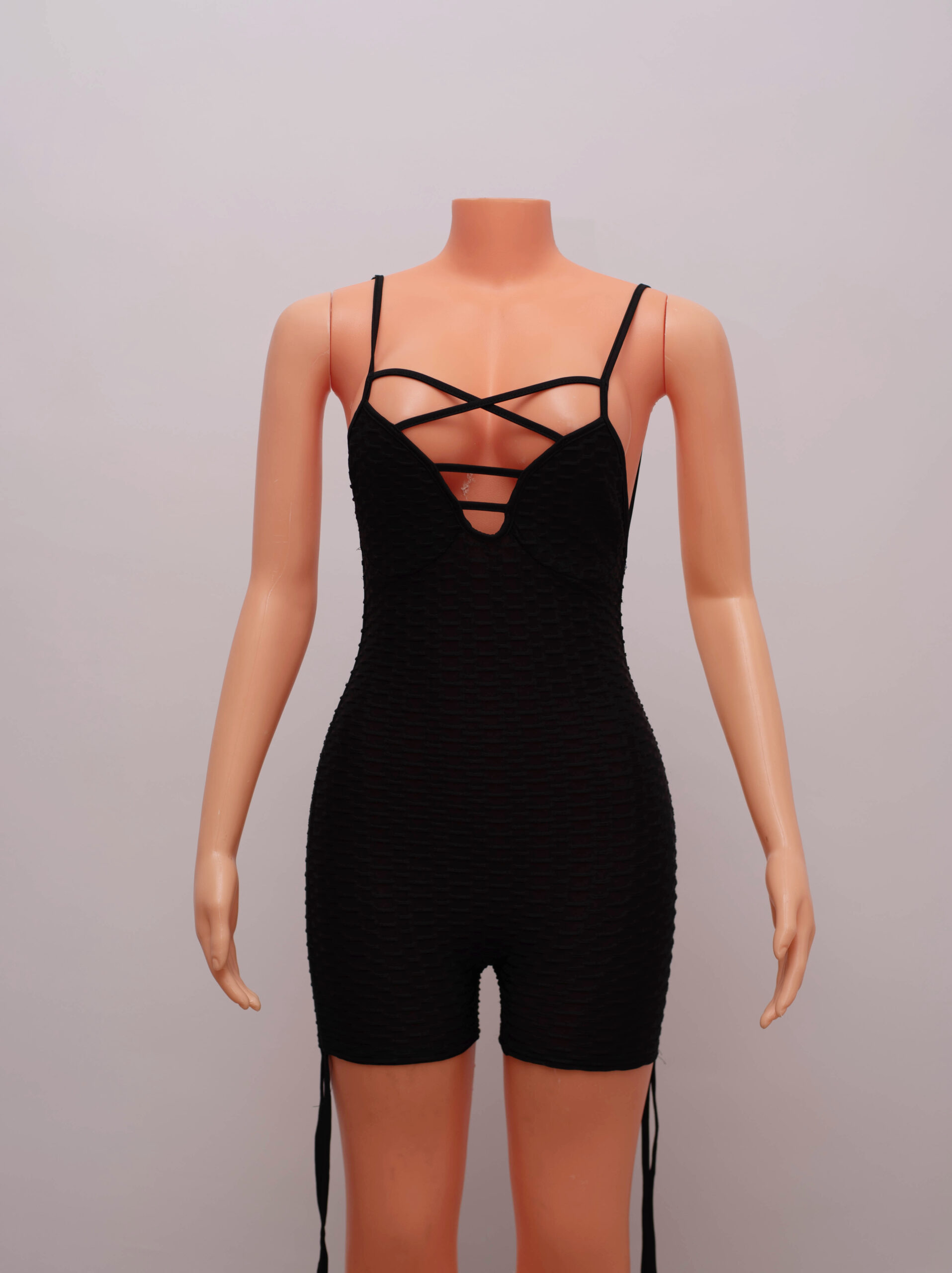 Fierce meets flattering in this Black Crisscross Honeycomb Romper, a head-turning one-piece designed to sculpt and stun. Made with textured honeycomb fabric, this stretchy romper hugs your curves while offering breathable comfort and flexibility. The plunging neckline features bold crisscross strap detailing, adding a sultry edge to the otherwise sleek silhouette. With its body-contouring fit and daring cut, it’s perfect for nights out, festival looks, or making a bold fashion statement wherever you go. Pair it with heels or sneakers — either way, you’re serving body and confidence.