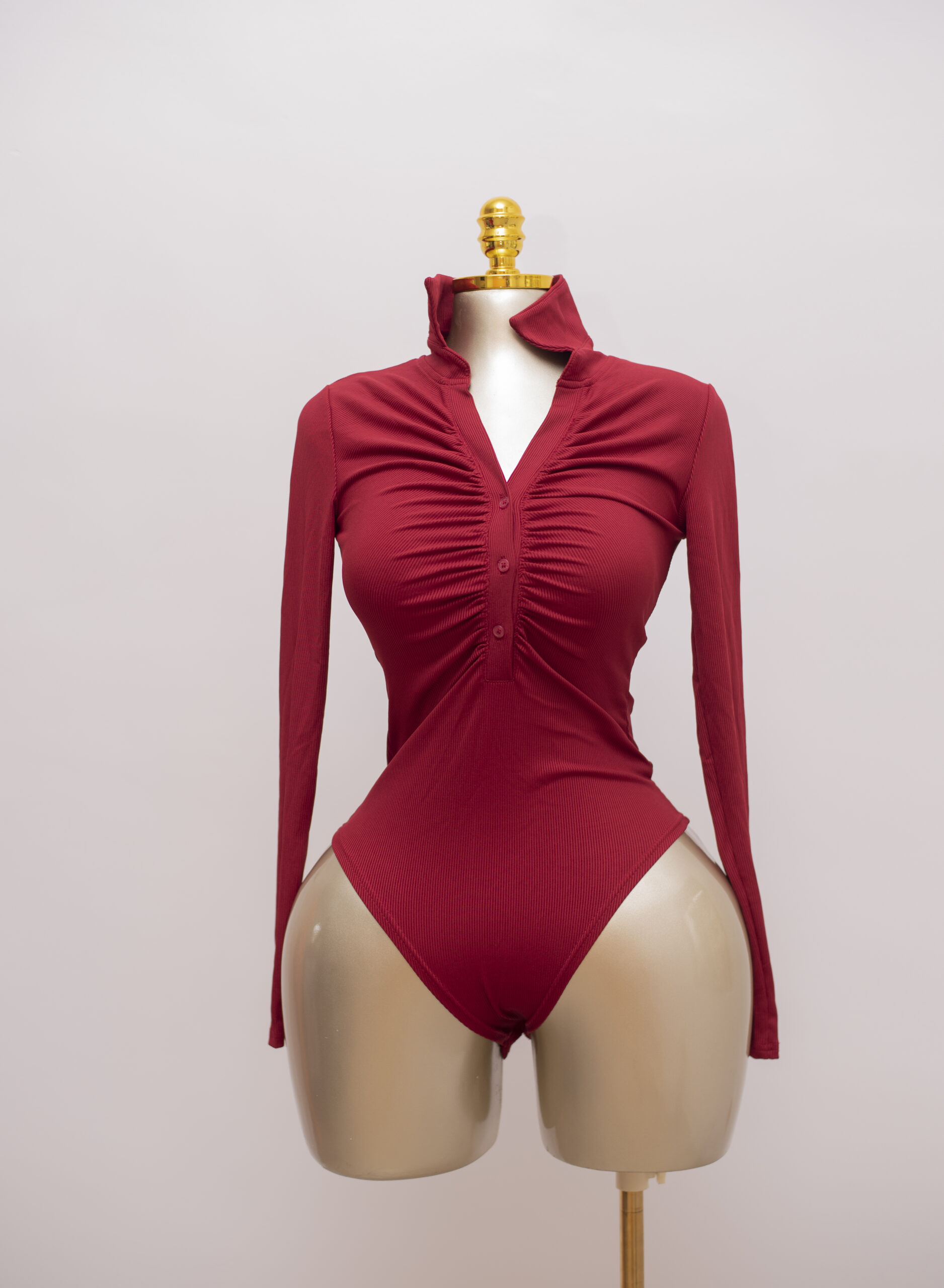 Ruched Wine Ribbed Bodysuit with Collar Detail